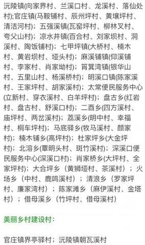 李畋镇潼塘村;白兔潭镇氽溪村;浦口镇联盟村;王仙镇书堂村;沩山镇老鸦山村;东富镇龙源冲村;泗汾镇枧上村;孙家湾镇观前村;船湾镇清水江村;沈潭镇美田桥村;嘉树镇玉茶村;明月镇云崖居委会;茶山镇转步口村;均楚镇周坊村;石亭镇石亭居委会;板杉镇七里山村;左权镇仙霞村;枫林镇金桥居委会;枫林镇蕉源村;官庄镇官庄村