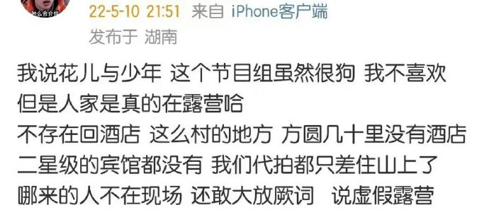 但也有蹲现场的代拍现身说法,表示露营的地方太村,方圆几十里都没有酒店,不存在让明星离开露营地。