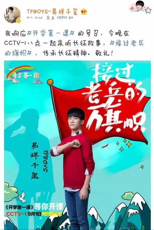 昨晚的《开学第一课》大家都看了吗?听到千玺唱"班歌"《第一课》了吗?开学有千玺的陪伴开心吗?(哈哈,小编我专业提问二十年,一直被追赶,从未被超越。。。。。)我感觉新编曲的《第一课》,千玺唱的很好听呢,又是开口跪系列啊!不管是2014年的,还是2016年的,每次听到千玺唱到"你好"这两个字的时候,都觉得自己已经被苏的血槽已空了呀!!!