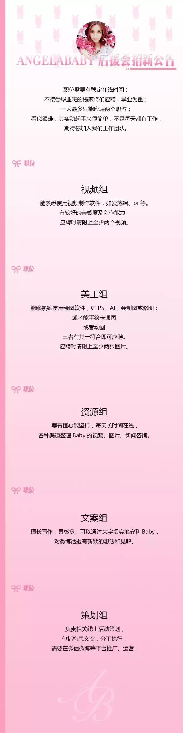 come on angelababy后援会招新啦 港台女星 2016-03-05 17:54:20 169 创作不易,用心坚持,欢迎请BaGua喝几杯爱心咖啡!打赏并支持本文 打赏并删除本文 只要你有一定的才华!只要你有广阔的爱心!只要你有坚定的耐心,信心!那就加入我们吧也许你会说:我可能才华不够,也许比我厉害的大神都报名了,我怕搞砸了所以不敢报......但我们告诉你:才华的事,有就很牛了,加入后我们可以一起培养!你已经是大神了,只是你自己太谦虚,不要抑制自己的才华小世界!强大的工作团队,大家彼此互相帮忙,搞砸了不可怕,最重要有那份为baby做事的心!小贴士这是一份没工资的工作,重要的是爱心下图是招聘职位信息,有意者根据要求私信至@angelababy后援会总会此文末尾点击“阅读原文”即可直通@angelababy后援会总会 微博 创作不易,用心坚持,欢迎请BaGua喝几杯爱心咖啡!打赏并支持本文 打赏并删除本文 感谢您的支持鼓励,我会继续努力的!文章地址:用户邮箱:打赏金额:USDT 请输入数字点击”去打赏“,即可进行打赏支持本文章哦 angelababy 发表评论