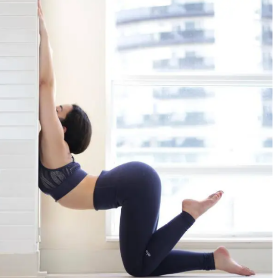 上半身向前倾斜,手臂,下颚,胸部靠近墙壁。