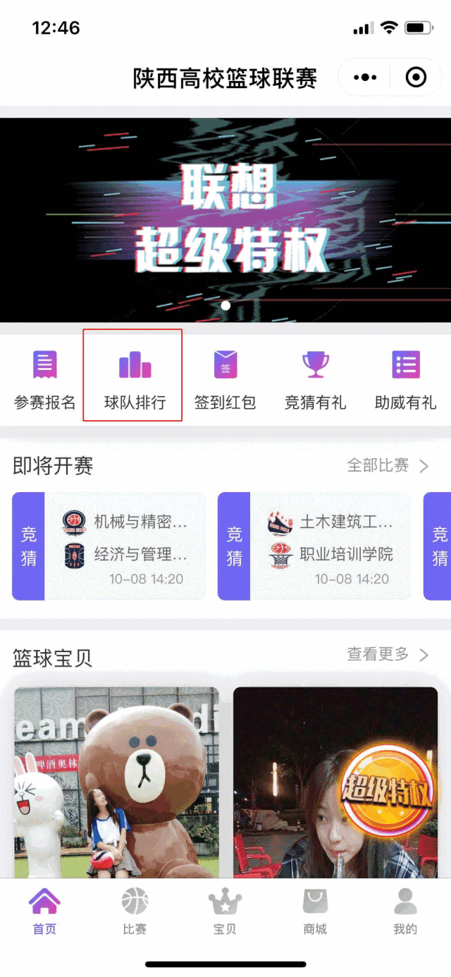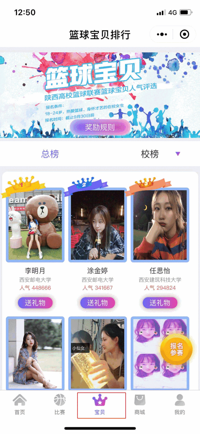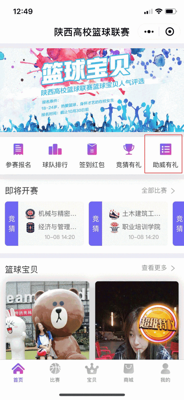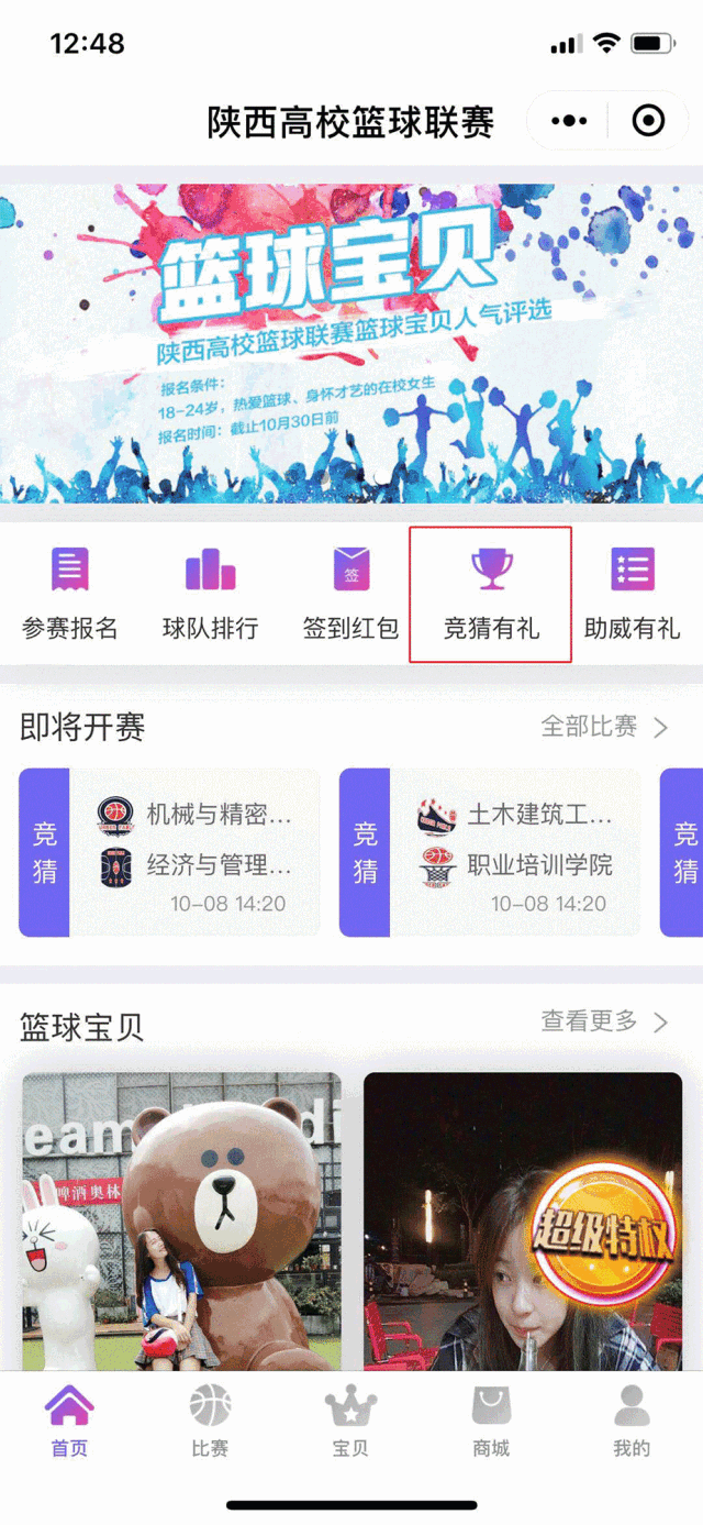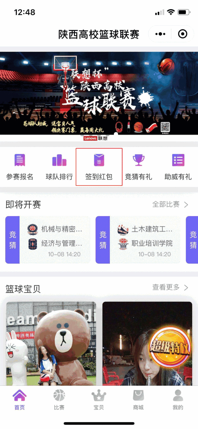心系赛事,天天签到打卡的宝宝一定是真爱,话不多说,红包奉上。进入“陕西高校篮球联赛”小程序首页,三种方式都可以获得红包奖励:点击“签到红包”、给篮球宝贝送礼物或参与竞猜,红包立刻就收入囊中。