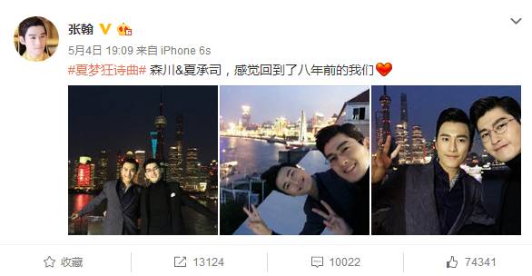 5月4日,张翰在微博上晒出一组套图。并发文:“森川&夏承司,感觉回到了八年前的我们”。图中朱梓骁和张翰肩并肩,面带微笑对着东方明珠拍照,让人感觉回到了八年前二人一起出演《一起来看流星雨》的时光。