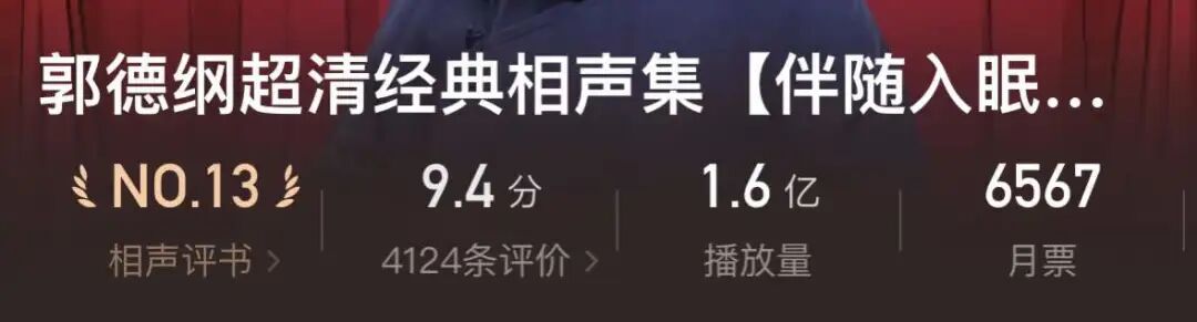 郭德纲,35岁男人的哄睡神器 凤凰WEEKLY 内地男星 2023-05-26 18:07:16 177 创作不易,用心坚持,欢迎请BaGua喝几杯爱心咖啡!打赏并支持本文 打赏并删除本文 文/章鱼编辑/花木蓝“晚上不听郭德纲就睡不着觉”;“听到别的相声演员的声音,怎么也得爬起来调回郭德纲”......当00后还在深夜刷视频时,听郭德纲的中年人已然进入梦乡。即使在明星圈内,郭德纲的相声也是出了名的哄睡神器。综艺节目上,好几个明星都说,入睡的小妙招,就是播放郭老师的相声。就这样,郭德纲成为了中年人的“催眠大师”。在互联网上,有这样一句振聋发聩的铁证:“感谢郭老的陪睡之恩”。郭门陪睡,百无禁忌没人知道第一个靠郭德纲入睡的人是谁,但中年人需要郭德纲,已是不争的事实。自曝靠郭德纲入睡的中年人越来越多。先是张靓颖在《天天向上》说自己“睡前必听郭德纲”,后来有记者问李健睡前听什么,答案只有三个字:“郭德纲”。就连吴京回顾自己的“港漂”生涯,都会提到郭德纲的妙用:沈梦辰录制《乘风破浪的姐姐》时,也吃下了其他姐姐的“催眠”安利。因为入睡需要,马东甚至把郭德纲归为“某种音乐类型”。就连郭德纲自己也耷拉着眉毛感慨:老在节目中碰见演员谢他多年陪睡之恩。保守了,郭德纲还是保守了。要知道靠他陪睡的,可不止演员。睡前郭德纲,根本就是件没有圈层壁垒的事情。在某音频APP搜索郭德纲,全站排名第一的专栏是《郭德纲21年相声精选》,播放量高达30.1亿。根据该网站的大数据:用户听相声的高峰时间段在0-4点、22~2点。“助眠”位居入选夜间搜索关键词的前五名,其中“相声”在助眠搜索中占比70%,“郭德纲”占比31%。毫不夸张地说:郭德纲凭借一己之力,挑起失眠音频市场1/3的KPI。“睡前郭德纲,白天吃得香”。听众对郭德纲陪睡的选题非常宽容,只有区区九个字:“只要不唱叫小番,就行。”叫小番出自四郎探母“站立宫门叫小番”,需要用特别突出拔高的音来唱出番字,经常把本已进入梦乡的网友一嗓子喊醒,因而让所有“睡前郭德纲”用户闻风丧胆。除此之外,郭门陪睡,百无禁忌。为了保证催眠质量,一些野生up主开始剪辑无唱版郭德纲,挑选音量均衡的段落剪辑在一起,并取名“睡觉专用”、“睡前盛宴”、“郭德纲相声合集(助眠版)”,甚至还有睡前相声盲盒......就连德云社官方也在某音频软件上传了剪掉杂音的伴眠相声集,售价19.9元,播放量已达1.6亿。如此多样的产品和庞大的点击量,让人不由心生疑惑:郭德纲到底有何不同?郭德纲,中年人的精神马杀鸡郭德纲,是中年人的睡前读物,是他们窥探中国式人性、人情、人心的窗口,甚至可以打上信仰的tag。每个“睡前郭德纲”的中年人,对郭德纲的经典语录都不陌生。最难得的是,郭德纲是百变的。他偶尔是个暖心的天津大哥,宽慰低谷的中年人“早成者未必有成,晚达者未必不达”;他有时也是洞察世事的人间清醒,直言“穷人站在十字街头耍十把钢钩,钩不着亲人骨肉;有钱人在深山老林耍刀枪棍棒,打不散无义宾朋”;他更擅长毒舌爽文,敢叫嚣“如果你容不下我,不是你的心胸太狭窄,就是我的人格太伟大”……寂静深夜,久经风霜的中年人很难不被这些话戳中,“通透”,是他们对郭德纲最大的赞美,更是睡前复盘人生得失的落点。越是无奈的中年人,越需要郭德纲的精神马杀鸡。郭德纲也是中年人的社交导师。有人说从郭德纲的相声里精心概括出10个万金油接话接梗法,把接梗技巧用于生活、酒局之中,锻炼应变能力。更有人靠睡前学到的怼人小技巧,在办公室发光发热。就连睡前要听郭德纲这件事本身,都是一个百用百灵的社交话题。中年人社交,就像朱一旦的生活一样朴实无华。国际形势家庭纷争根本不是三言两语说得清的,聊深了反而影响社交关系徒留十分无奈。而郭德纲,就是中年人之间的最大公约数。比如,这篇稿子的选题,就来源于我的同事王富贵。在团建的饭桌上,大家已经聊不出新意时,王富贵说起了自己的烦恼:他习惯中午看国际和财经新闻,睡前才听郭德纲,但大数据总是弄错,在中午给他推催眠相声,又在晚上推国际新闻。更让他无语的是,因为大数据的推送机制,他的主页全是自己听过的内容。为了让视频更短,博主们总把相声剪成上下两段,但视频标题却又是毫无对应关系的数字。听完某段相声的上集,他对后面的内容非常好奇,却怎么搜索也找不到下集的内容。这让王富贵非常抓狂,他本想私信这位博主,却碍于自己大V认证的身份,不好意思这样做。就这样,“睡前郭德纲”的话题,成功助推了团建的氛围。郭德纲功德再+10086。当然,人间清醒语录和社交技巧学习,只是睡前郭德纲的好处之一。他最大的魔力,还是拥有让人三分钟入睡的功力。中年人到底有多需要郭德纲陪睡呢?早在2019年,中国睡眠障碍人群就已突破4亿。艾媒咨询数据显示,年龄在31-40岁的失眠人群占43.4%。这是一个比想象中更为庞大的群体。郭德纲,更适合中年宝宝体质解密“睡前郭德纲”,是门学问。在知乎搜索“睡前郭德纲”,你可以找到一堆类似的问题:〓 关于“睡前郭德纲”的十万个为什么这些问题下有数百个答案在剖析郭德纲,音色是被提到次数最多的关键词。其实说一个相声演员的表演催眠,难免会让人陷入怀疑——是不是他的表演太无聊了?但“睡前郭德纲”的忠实用户却有另一种解释: