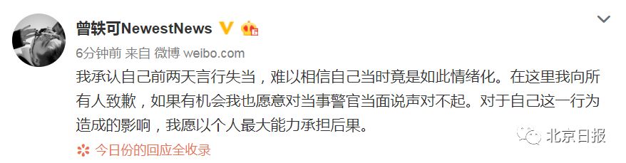 我承认自己前两天言行失当,难以相信自己当时竟是如此情绪化。在这里我向所有人致歉,如果有机会我也愿意对当事警官当面说声对不起。对于自己这一行为造成的影响,我愿以个人最大能力承担后果。