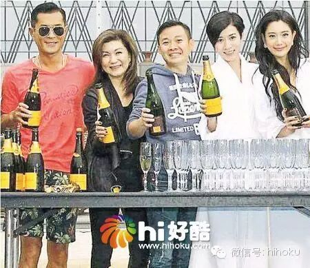 古天乐(左起)、乐易玲、文伟鸿、佘诗曼及Clara齐齐开香槟庆祝电影《使徒行者》顺利完成。(网上图片)