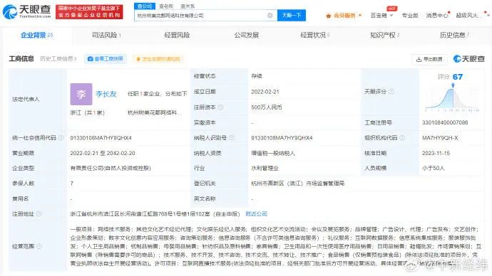天眼查App显示,涉事公司杭州树美花郡网络科技有限公司成立于2022年2月,法定代表人为李长友,注册资本500万人民币,经营范围包括文化娱乐经纪人服务、组织文化艺术交流活动、互联网直播技术服务、市场营销策划等,由李喜来、李长友共同持股。变更记录显示,11月10日, 陈宏翔刚刚退出该公司股东并卸任监事,该公司企业类型也由有限责任公司(港澳台投资、非独资)变更为有限责任公司(自然人投资或控股)。