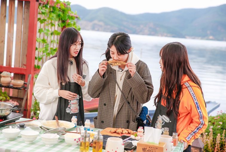 结束一天的劳动后,心满意足的三人回到湖边,用自己劳动获取的食材,准备晚餐,朵源CP决定用温馨的甜品来欢迎李艺彤的加入,于是按照老乡传授的秘方做苦荞粑粑,并配上纯天然的蜂蜜,和酸甜可口的养乐多,可爱的摆盘,一口咬下去,甜的人心都要化了。清脆的苹果也没有拉下,她们利落地洗净削皮,做起了罐头,锅上的热水咕嘟咕嘟地冒着,在一片蒸腾的热气中,姐妹们说说笑笑,回忆起了童年的趣事。