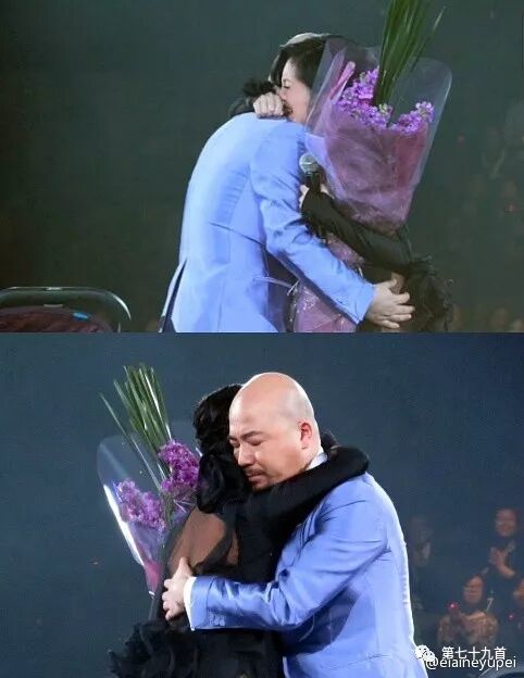 舞台上,wyman带着紫色的领带,捧着紫色的花,推着紫色的BB车,都是因为杨千嬅喜欢紫色。这个拥抱被称为“世纪拥抱”。一抱泯恩仇。