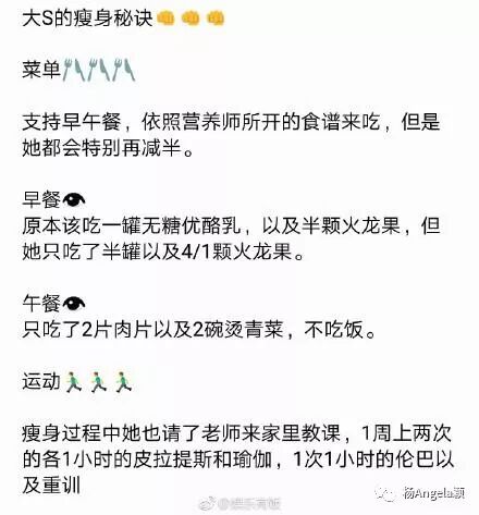 女明星们为了保持身材真是不容易啊,再看看这两日特别火的大S的减肥菜单,所以胖妹子们完全就是管不住嘴么!