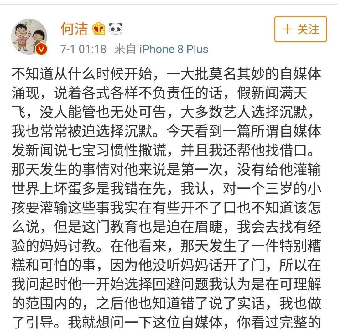 她先是在文中承认了自己在育儿中存在的一些错误,但部分自媒体“说着各式各样不负责任的话”,将七宝在节目中的行为放大解读为“习惯性撒谎”,使得何洁怒斥其违背良心误导大众,配不上媒体两字。