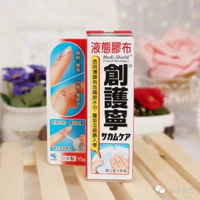 本品为透明胶状,味道很像快干胶,本身含酒精有消毒作用,所以涂抹瞬间会有那种擦双氧水似的刺痛感。擦完后,因为具快干特性,马上形成透明薄膜,紧紧的覆盖伤口。等它干燥后,不管做什么事,手上的伤口都不会影响到。就算一天洗多次手,薄膜都不会掉,更神奇的是,它还有促进伤口愈合的功效。为了便于撕掉,可涂厚一些。