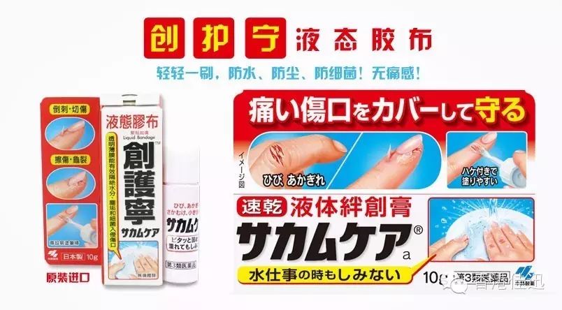 小林制药创护宁 是液态胶布,透明薄膜隔绝水分、尘埃,防止细菌入侵伤口,紧贴皮肤,专设易涂笔扫,可防菌抗菌,而且不会引起皮肤敏感,安全可靠,透明无色。