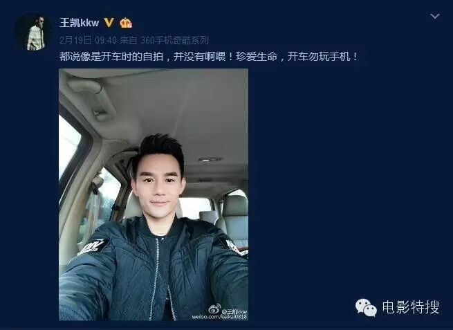 2月19日,王凯在微博上发布帅照并写到:“都说像是开车时的自拍,并没有啊喂!珍爱生命,开车勿玩手机!”