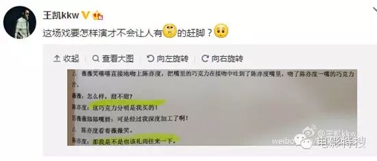 日前,王凯在微博晒出一段剧本内容,同时留言称:“这场戏要怎样演才不会让人有吐的赶脚?”原来,剧本中写着女生要将自己嘴里的巧克力吐到男生嘴里,还要问他“甜不甜”,之后男生还要“礼尚往来”一番。
