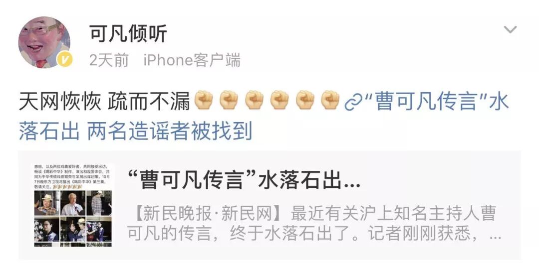 我半信半疑浏览了下微信内容,迅速作出了判断,道:“我觉得这基本上是个谣言。第一我知道曹可凡没给那家P2P公司代过言;第二作者将上海某位知名阿姨跟曹类比,显然不知道电视台里的情况——这阿姨只是节目的嘉宾,从来不是体制内的主持人。所以这多数是个不明就里的人编的故事,别信!”