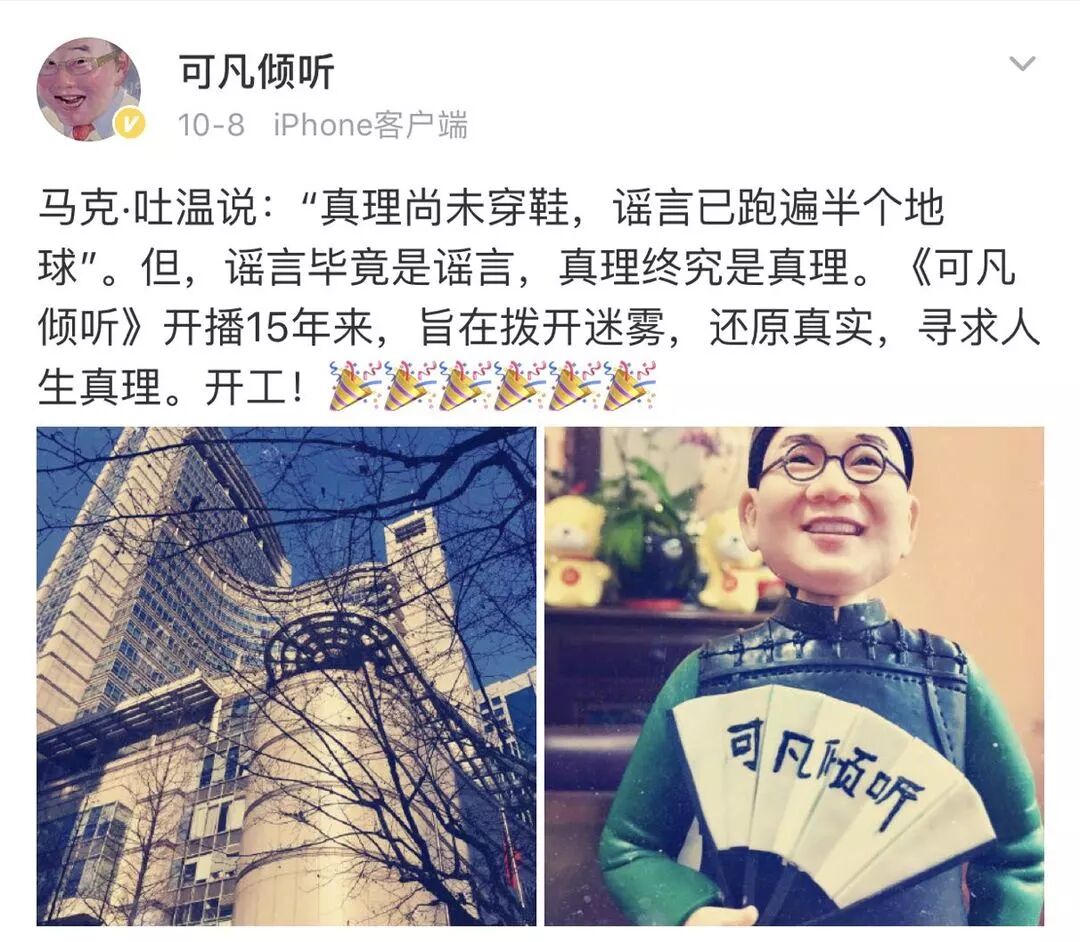 我也是在微信上知道,可凡这几天也一直通过微博在辟谣,可辟谣的速度实在赶不上传谣的速度,以至到最后他只能无奈地引用起马克.吐温的名言——“真理尚未穿鞋,谣言已跑遍半个地地球”……多少有点容易滑向阴谋论思维的我,没想到自己也被两个网上的小土豆在佳节里耍到抓狂……