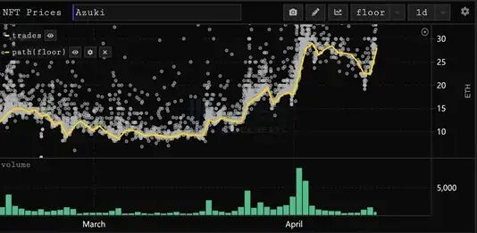 在「元宇宙生态」这一最高等级之下,Azuki 的突围显得十分耀眼。自 3 月 17 日开始,Azuki 的地板价不断创出历史新高,最高峰时接近 30ETH,涨幅超过 200%。
