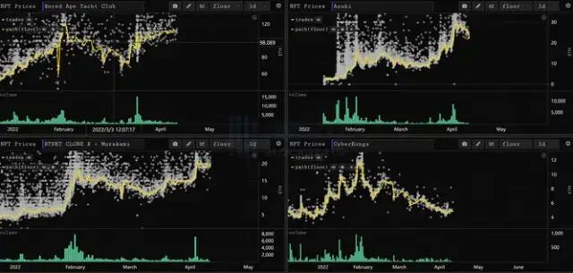3 月中下旬,Yuga Labs 打出了一套行云流水、威力巨大的组合拳,几乎以一己之力将熊打跑。此后,「蓝筹」间悄然出现了分化:BAYC 的地板价重新回到 100ETH 上方,Azuki 不断刷新历史新高,而 CyberKongz 和土地板块却在这轮狂欢中黯然失色。