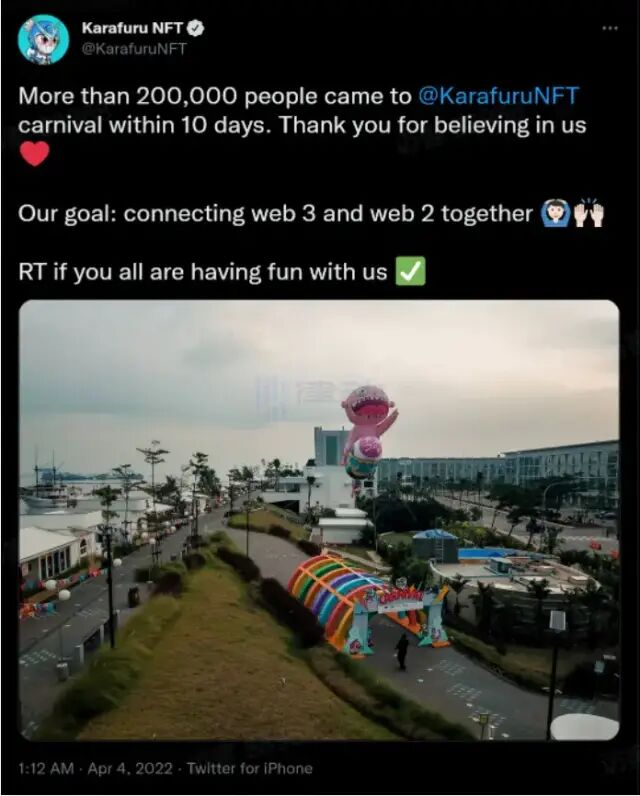 具有野心的项目,也在各自出招,探索扩大影响力的途径,尤其是线下。Karafuru 在 3 月底举办了线下的主题展,在 10 天内吸引了超过 20 万人前来参与。结束不久的 NFT LA 上,不少项目前往线下布道。这些都让我们看见了新的思路——主题派对、艺术展、体育赛事等线下活动都聚集了大量具有不同兴趣的人,从他们的兴趣作为切入点,让更多的人从现实世界中被虚拟的小图片所吸引,会不会是在品牌演化竞赛中升至前列的新思路?具有野心的 PFP 项目在「连接 Web2 与 Web3」的道路上争分夺秒。