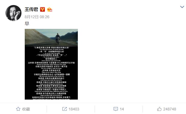 是的,顺着衰老也好,倒着生长也罢,只要生命线一头是开端,另一头就必定是终结,但我们手中还握着用自己的方式度过一生的自由,我们可以选择“碌碌无为”作为意义,可以选择“对得起自己”作为意义,但这个选择或是改变的瞬间,不管是过去、现在、还是将来,从来不晚。就像王传君微博中的截图一样:做自己觉得有意义的事,不管是过去,还是将来,永远不嫌晚。