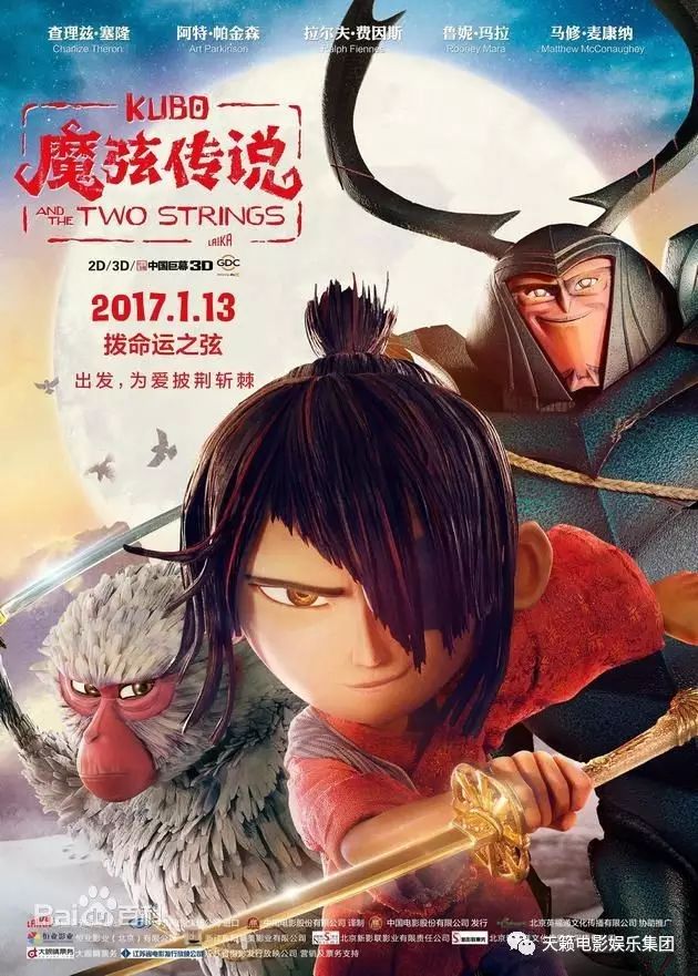 《魔弦传说》是由美国莱卡工作室出品的定格动画电影,由塔拉维斯·柯奈特执导,查理兹·塞隆、马修·麦康纳、鲁妮·玛拉、拉尔夫·费因斯联合配音。该片于2016年8月19日在美国上映,2017年1月13日在中国上映《魔弦传说》以日本文化为背景,讲述了生活在海边的小男孩久保无意中召唤了邪恶的怨灵,为了拯救他的家人,他踏上一场激动人心的冒险故事。