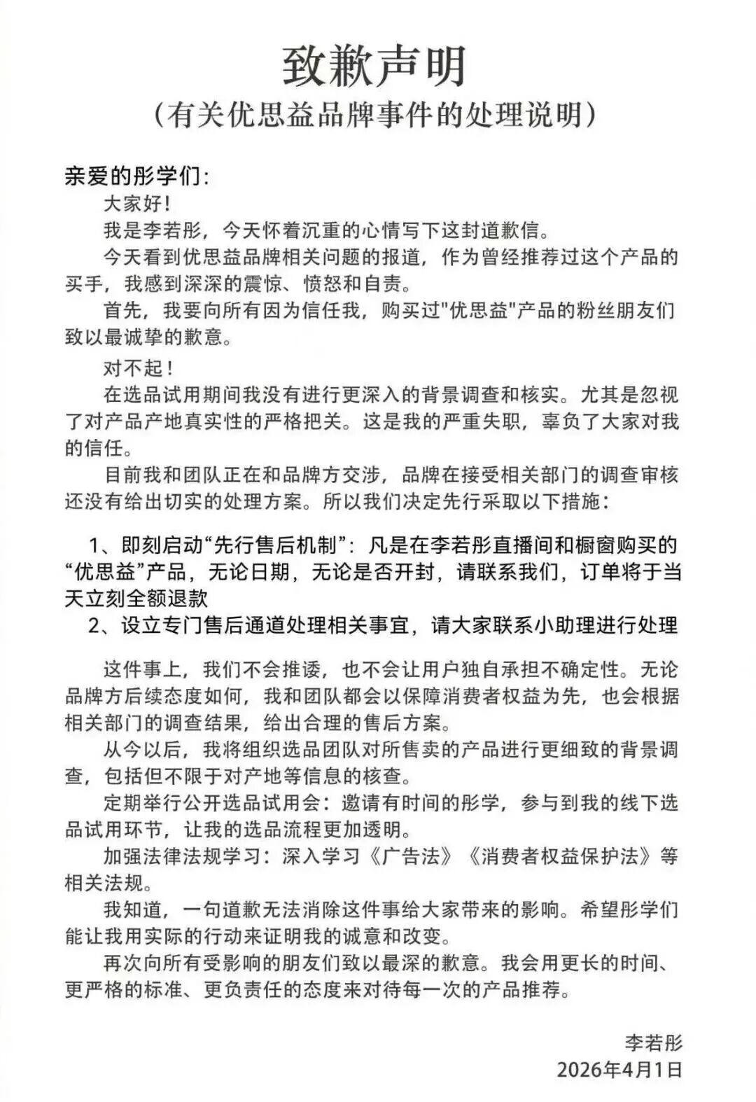 李若彤表示,即刻启动“先行售后机制”,凡是在李若彤直播间和橱窗购买的“优思益”产品,无论日期、是否开封,订单将于当天立刻全额退款。