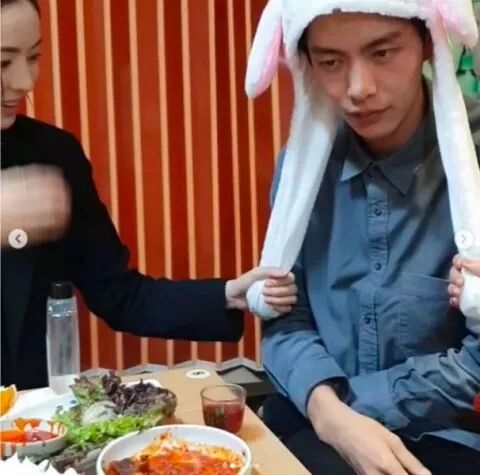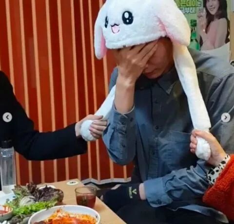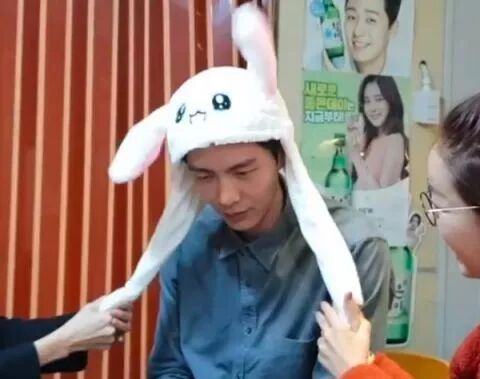 只见民基欧巴头戴着兔耳朵帽,被李多喜和文知茵两个妹子左右夹击,她们一人握住长绳的一边,随即,俏皮的兔耳朵在欧巴的头上一动一动的,相当可爱。