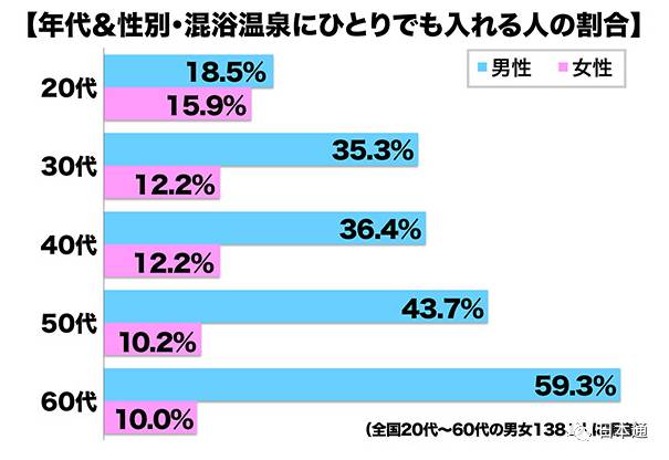 日本一项对1381名国民展开的调查显示,敢于一个人进入混浴温泉的男性约占4成,女性约占1成,男女差距较大。不过有趣的是,越是年轻的女性,占比反而越高。反而男性是约年轻越拘束啊。