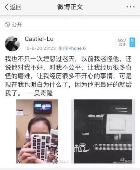 聊到最后,他给我分享了一段话:我也不止一次埋怨过老天,以前我老怪他,还说他对我不好,对我不公平,让我经历很多奇怪的磨难,让我经历很多不开心的事情,可是现在我也明白为什么了,因为他把最好的就给我了。—吴奇隆