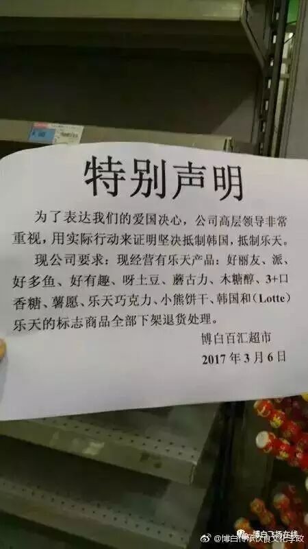 因而,乐天老总这样的话,这无意是火上浇油,抵制韩国产品也在百姓之间轰然兴起。好丽友,好多鱼,蘑菇力,以及韩国化妆品都遭到了抵制,拒绝购买。