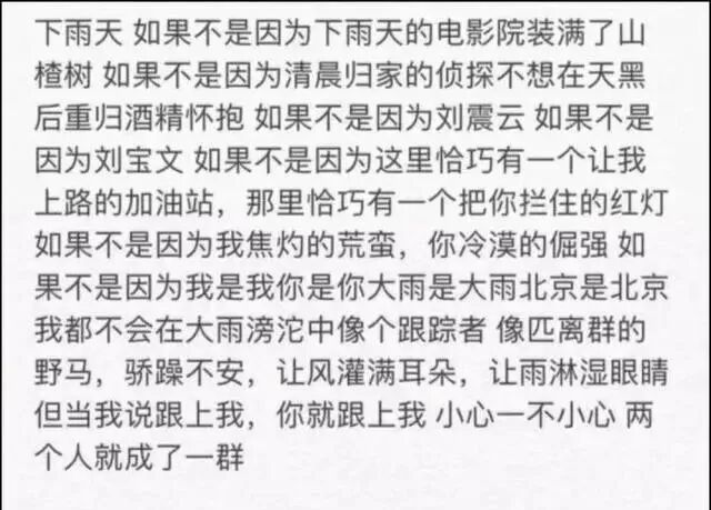 “如果不是这里恰巧有一个让我上路的加油站,那里恰巧有一个把你拦住的红绿灯,如果不是因为我焦灼的蛮荒,你冷漠的倔强,如果不是因为这场大雨···,当我说跟上我,你就跟上我,小心一不小心,两个人就成了一群。”