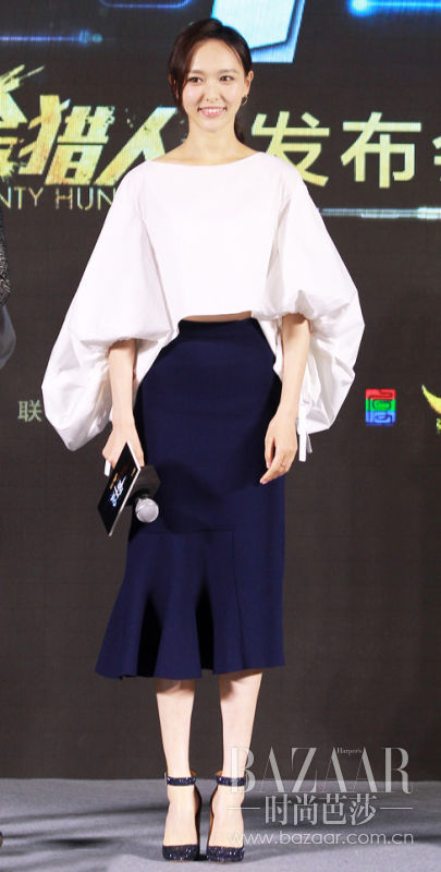 糖糖的又一个大长腿Look,长度尴尬的过膝半裙因为超高腰设计,竟然也照样美出新“长”度!