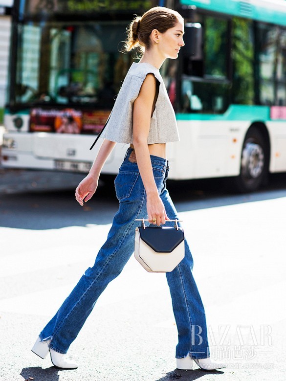 在丹宁系列中,阔腿高腰裤是一样非常讨喜的单品。超高腰线立现大长腿,搭配CropTop小短衣,粗犷的皮革腰带和包包一起,帅气而又充满青春活力。再也不用担心暴露了腿部的不完美。