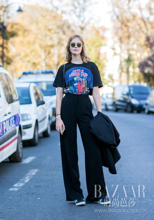 别以为阔腿裤只能走女神范,一条黑色的超高腰阔腿裤,那几乎可以跟任何风格百搭。比如一件夸张的图案宽松T恤,长腿的既视感和休闲街头风格分分钟赚足眼球,哪怕是穿平底鞋也能拉风到不行。