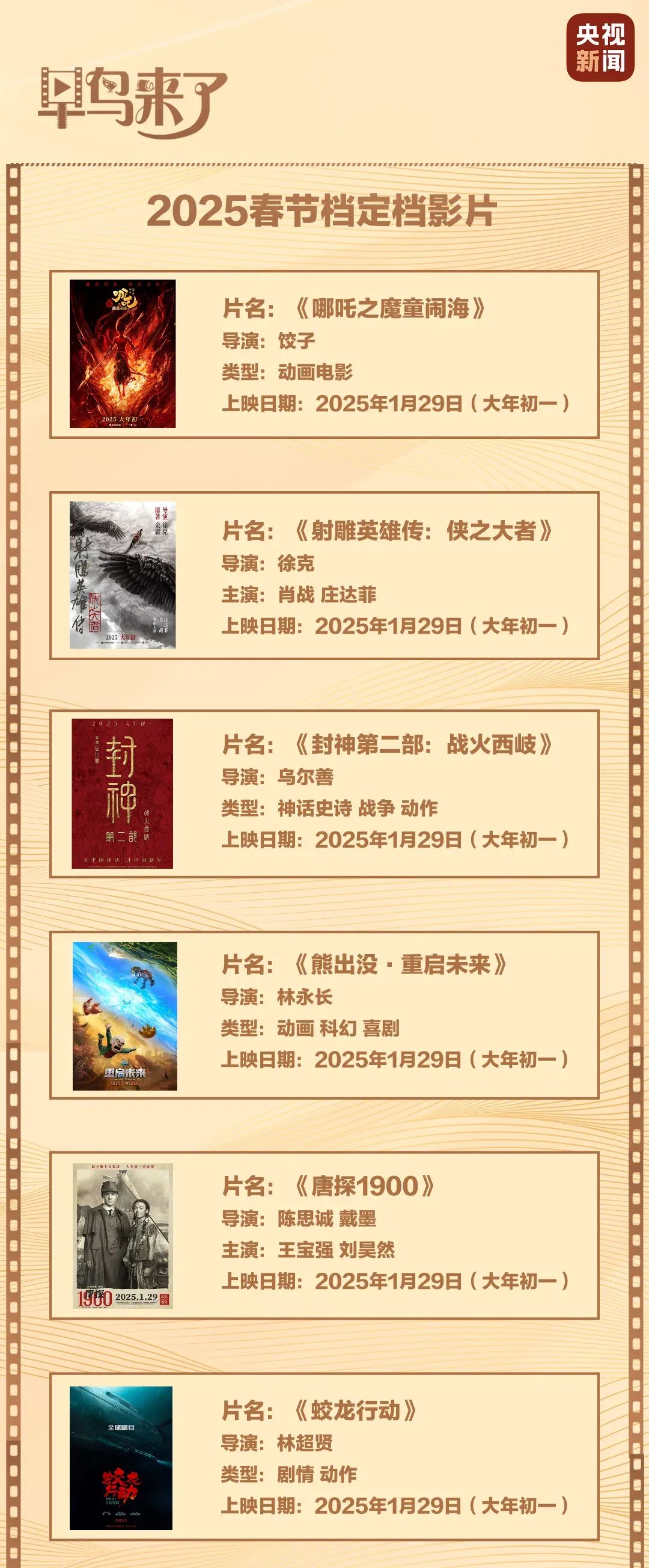 目前共有6部新片确定参与2025年春节档的票房“大战”,全部都是大年初一(1月29日)正式上映,春节档电影“想看”总人数已经突破300万,数据还在不断上涨中。