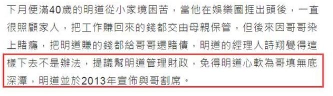 据台媒爆料,经常是哥哥找到妈妈,妈妈再找到明道,以至于明道经常心软拿钱给哥哥还债。