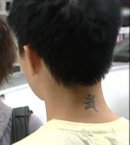 颈后的纹身是梵文,意为文殊菩萨,属兔的守护神。李灿森75年生人,属兔。