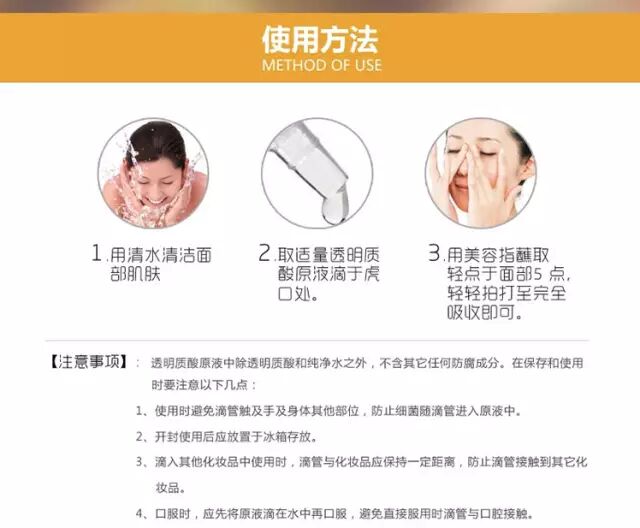 洗去面部赃污,畅通毛孔的同时,防止肌肤水分流失皮肤干燥时,如果单独使用高浓度的保湿剂(如5%透明质酸),并没有直接的保湿效果,甚至会因为玻尿酸从皮肤吸大量水分,使用后反而会使皮肤更加干涩。所以正确的用法是,早晚洗完脸后,只需要将2~3滴透明质酸放在手心,加上适量清水混合,薄薄涂抹在脸上,这样更有效果,一瓶玻尿酸也可以使用1~2个月以上