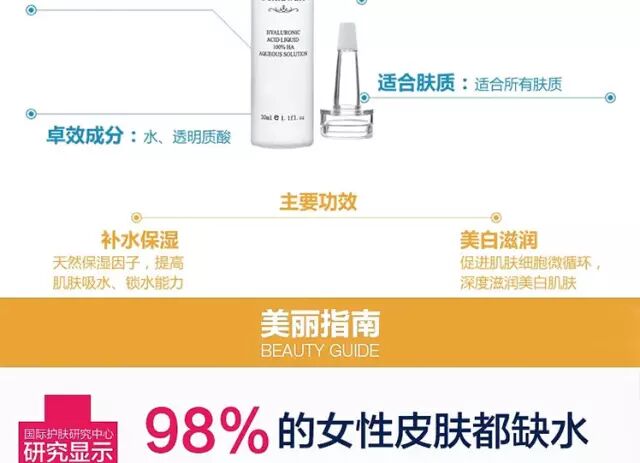 透明质酸是天然高效保湿因子,与人体皮肤亲和度高,能提高肌肤吸水、锁水能力,修复受损肌肤,促进肌肤血液循环,深度滋养肌肤。本品无任何化学添加,无刺激,适合各种肤质使用。若口服经消化系统吸收,更可补充体内缺少的透明质酸,从真皮层锁定水分,对抗岁月痕迹,再造完美肌肤。