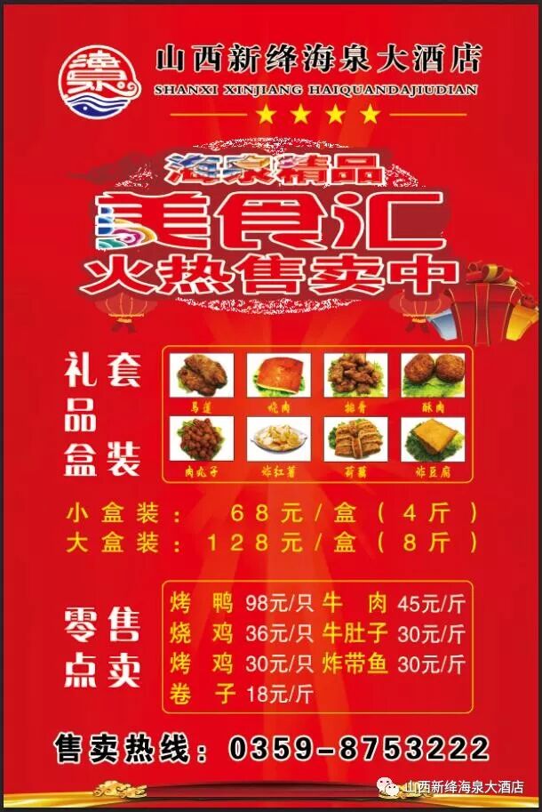 海泉大酒店精品美食汇结合新绛县民俗文化推出春节精美礼品盒,以绛州火锅为主要载体的八种精美食材:排骨、藕合、肉丸子、炸豆腐、马莲肉、酥肉、烧肉、鱿鱼;同时还有海泉系列美食:北京烤鸭、海泉烧鸡、海泉烤鸡、海泉特色牛肉、牛肚、干炸带鱼等。