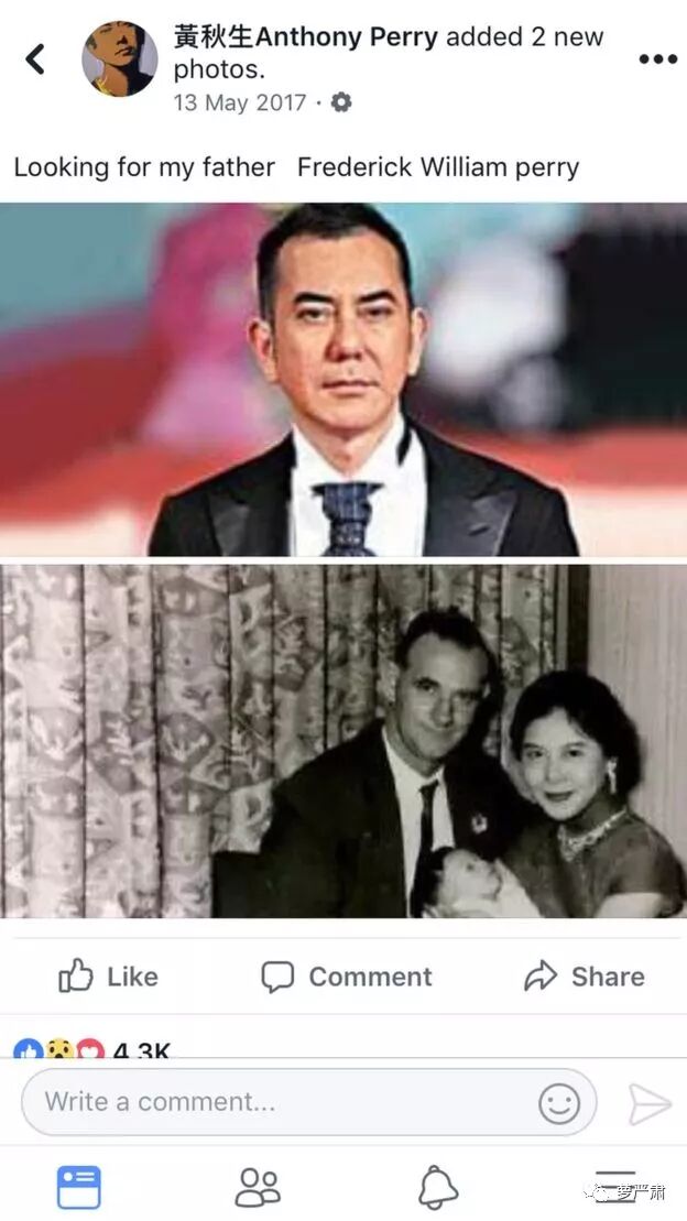 「Looking for my father. Federick William Perry .」黄秋生2017年5月发的。