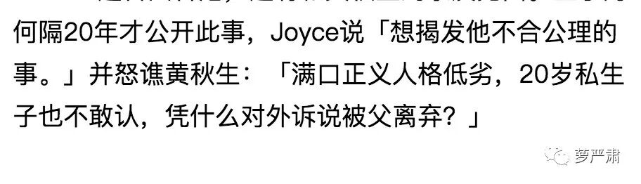 这位Joyce说,自己想「揭发他(黄秋生)不合公理的事」,又说黄秋生是“人格低劣”。