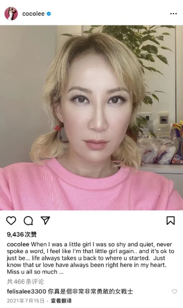 2021年7月,李玟在Instagram上罕见发出了一张面无表情的自拍,照片中,她穿着粉红色T恤,用橘红色的皮筋扎起两揪短辫。文字中,她写道: