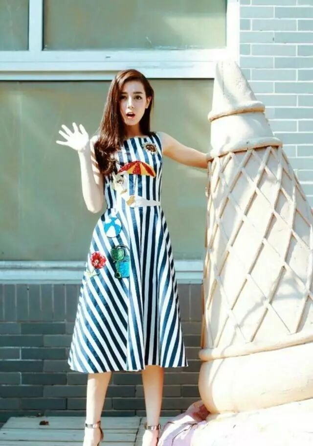 条纹连衣裙加点个性时髦贴布,很简约时尚,脚踩一字带凉鞋,优雅大方。
