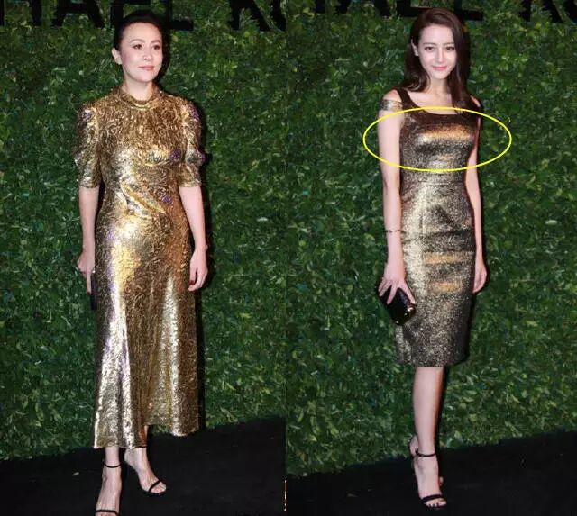 迪丽热巴和刘嘉玲撞衫,同样的金色装搭一字高跟凉鞋,这次迪丽热巴的胸和满脸的胶原蛋白赢了。