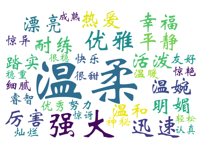 大家眼中的wyjj是什么样的呢?让我们尝试绘制一个词云图吧~首先,自动对中文文本进行分词和同义词合并,然后根据词性进行筛选,仅展示特定词性的词语。根据初步获得的结果,调整展示关键词的数量和缩放比例并手动添加“忽略词”列表(无意义的过渡词和误入的负面词语等),经过多次迭代后得到最终的词云图。