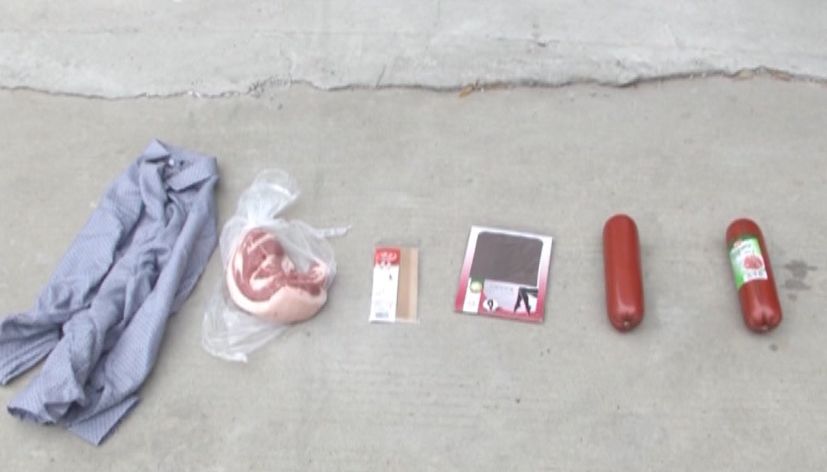 首先,我们准备了两根猪肉肠和一个可乐瓶来模拟人腿,并将丝袜分别套在猪肉肠和可乐瓶上,来模拟检测人体穿着丝袜遇到火源时,对皮肤造成的损伤程度。