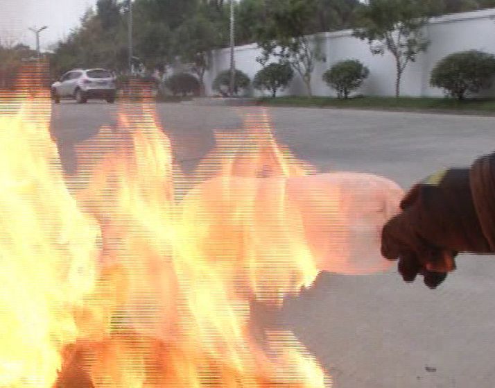 随后,消防人员又点燃了一个油盆,模拟火灾现场,并将套上丝袜的可乐瓶和猪肉肠靠近火焰。