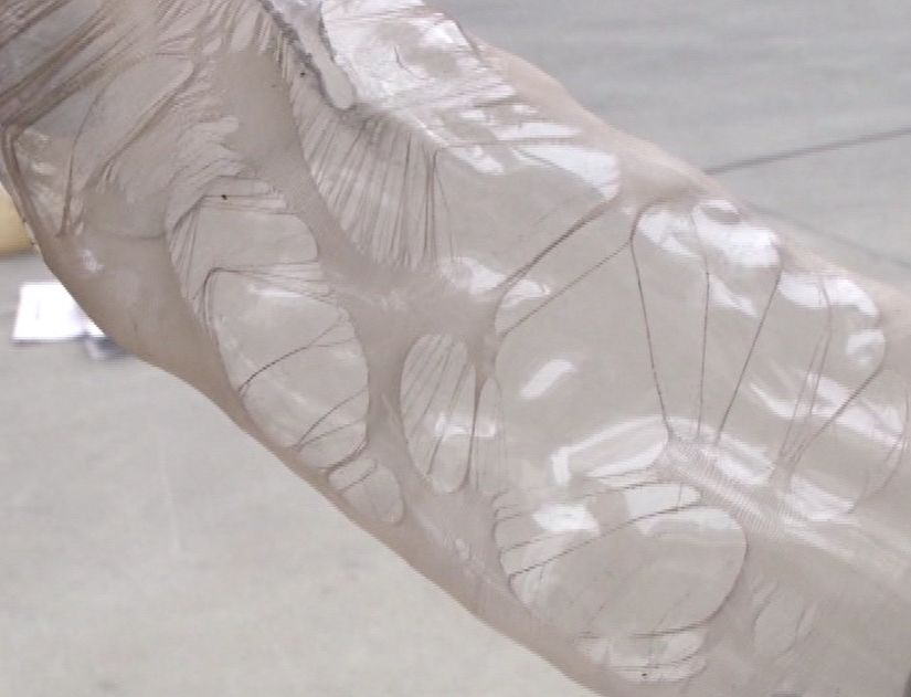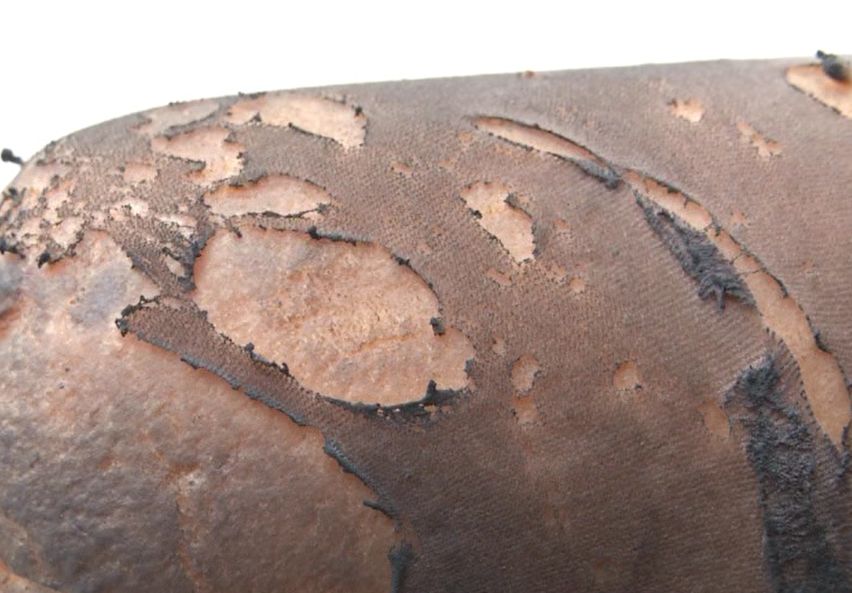 可以看到,当火苗碰到袜子的一瞬间,袜子表面就发生了变化。靠近火苗的地方,形成一个个宽度不等的破洞,还有很多的焦灼物依附在上面。